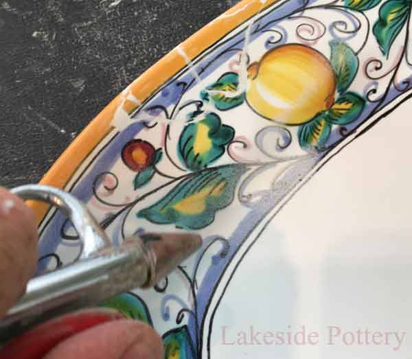 Footstep-by-stride procedure of performing a seamless repair on a chipped large Italian platter using the all-time commercially bachelor materials including cementing, filling, painting, and glazing. This process can use to chipped plate, chipped vase, bowl, pitcher, figurine or whatever pottery, cathay or ceramic vessel.